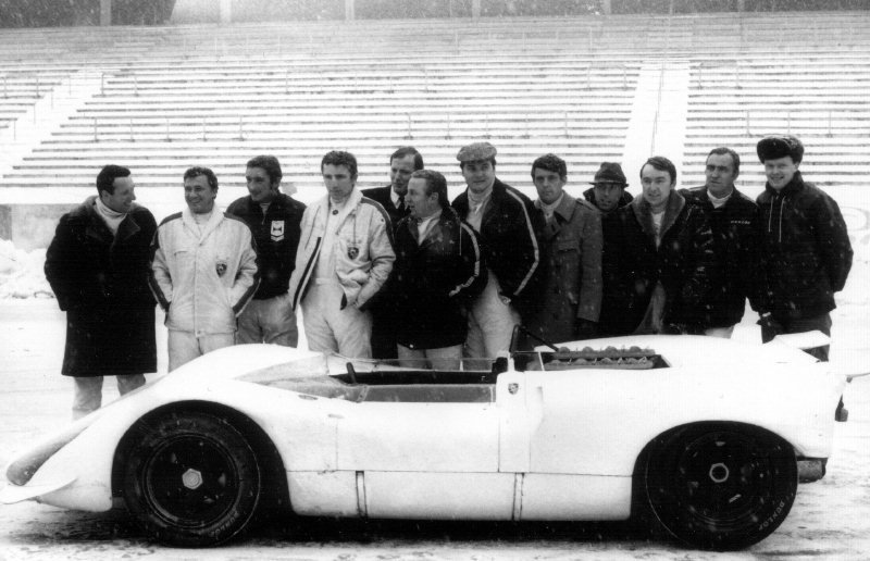Im Frühjahr 1969 stellte PORSCHE am Hockenheimring die neue Werksmannschaft vor. Hier ein winterliches Bild des Teams mit dem Bergspyder im Vordergrund