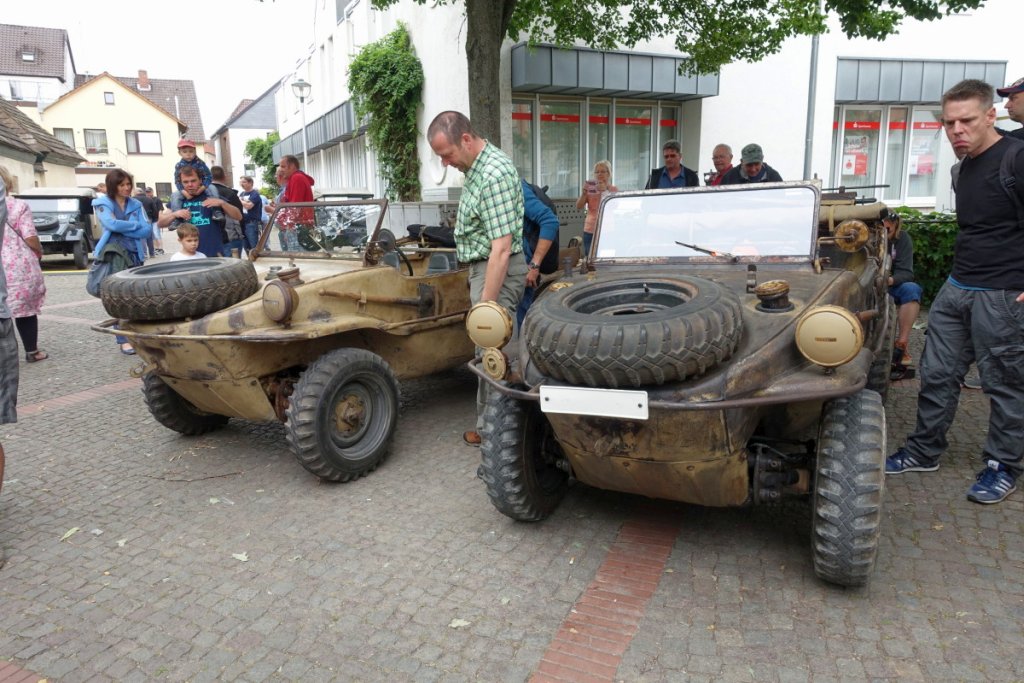 Oldendorf abgesperrt. In Reih' und Glied standen dort VW-Oldtimer aus 28 Ländern - Brezel-Käfer, Kriegs-Kübelwagen, Karmann Ghia Cabriolets und VW-Bullis in allen möglichen Varianten.